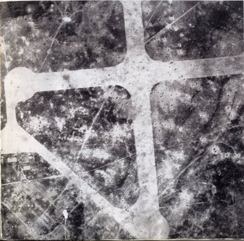 Japanese airfield with runways pitted by aerial and surface bombardment. (From an island off the coast of Iwo Jima from the USS Anzio)