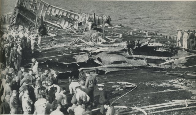 View of the Flight Deck looking forward after the fire had been extinguished. (Action took place on the USS Sangamon)
