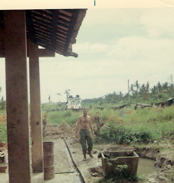 A photo of the entrance to Camp Rowe and the Alpha Company Banner